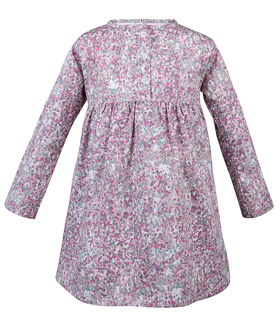 Romantisches Kleid gemustert in Rosa/Grau mit einer kurzen Druckknopfleiste vorne bis zur Taille.